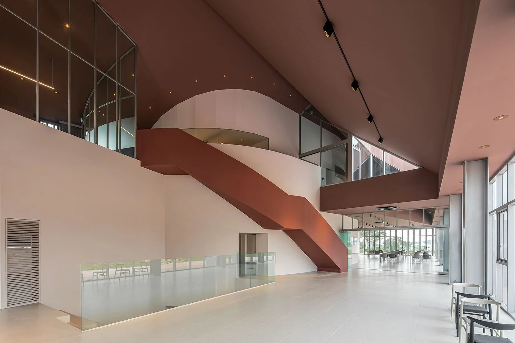 THE ARK 70 프로젝트는 초기 단계의 산업단지에 위치하여, 향후 이 단지가 완성되면 사람들 간의 교류를 증진시키고 벽산의 브랜드 이미지를 형성하는 상징적 건축물이 되도록 설계되었습니다. 이 건물은 모든 이용자가 환영받고 다양성이 존중되는 포용적 업무 공간을 목표로 했습니다. 내부는 사무와 공장 근로자 모두가 사용할 수 있는 개방적이고 휴식에 적합한 공간을 제공하여 자연스러운 소통과 협업을 지원합니다. 외부 재료로는 벽산에서 생산한 베이스패널을 사용해, 회사의 역사와 연결성을 강조했습니다. 이를 위해 베이스패널의 제조 공정을 재검토하고, 표면 질감, 색상, 처리 방식에 대한 다양한 실험을 진행했습니다. 이 과정을 통해 베이스패널로 구현할 수 있는 새로운 디테일을 현장에서 발견하고 적용했습니다.